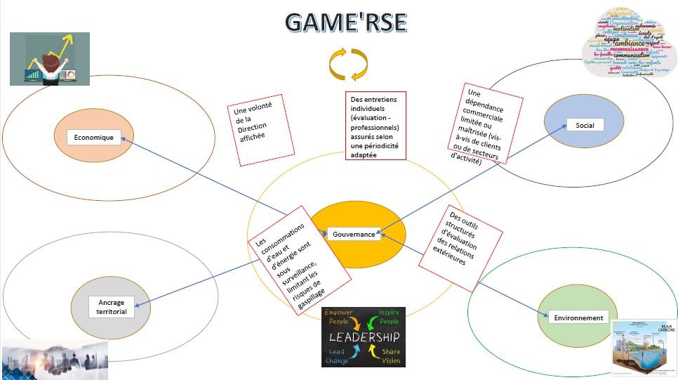 Les participants évaluent la performance de l'entreprise sur les thèmes ECONOMIQUE - SOCIAL - ENVIRONNEMENTAL - ANCRAGE TERRITORIAL - GOUVERNANCE et identifient des pistes de transformation, des méthodes de coordination et de mesure.